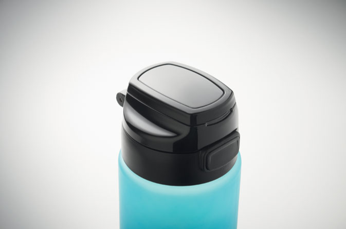 Sports water bottle in RPET, motivational time markings, one hand opening flip top lid, safety lock and carrying strap. Capacity: 1L.