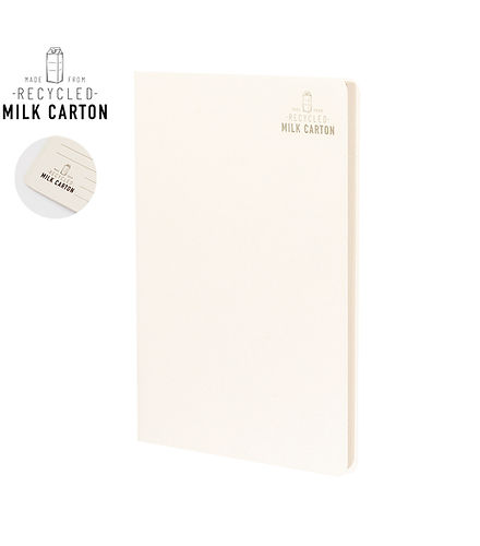Notebook made from Recycled milk cartons. With soft covers, stitched finish and 60 inside sheets of white paper, and single striped. Recycled Milk Carton logo at the front cover and inside pages. Presented in an individual Recycled bag.Milk cartons are mostly made of cardboard and Aluminium. During the recycling process, the different packaging materials are separated for reuse and re-purposing, thus contributing to the infinite path of the circular economy. This material is well known for its high recyclability, as well as for its lightweight and resistance.|60 Sheets