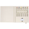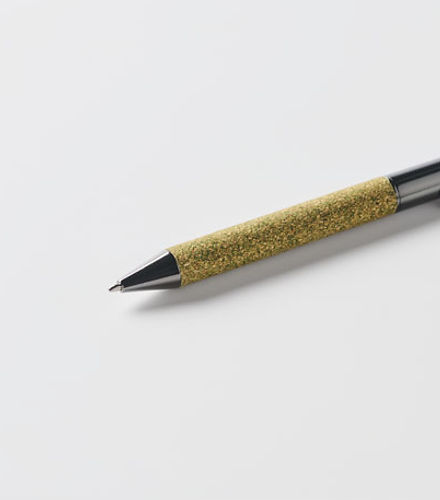 Twist metal ballpen with fabric on barrel made of 20% tea grounds, 30% cork, 50% polycotton cloth in carton box. Blue ink.