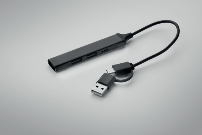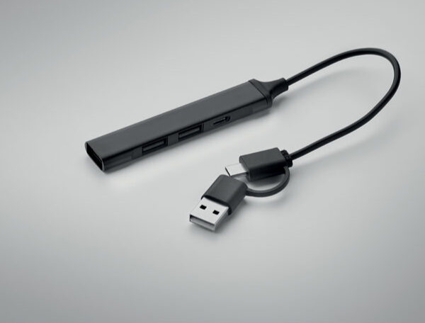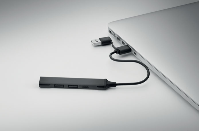 4 ports USB hub in recycled aluminium. 3 USB-A + 1 Type-C. Input: 2-in-1 Type-C & Type-A. Cable length: 19 cm.