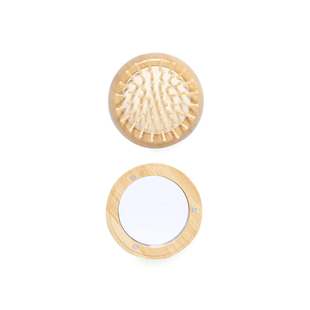 Unique brush with mirror made in natural bamboo. Its magnetic attachment and compact size makes it a perfect accessory for everyday use. Presented in an individual kraft design box.