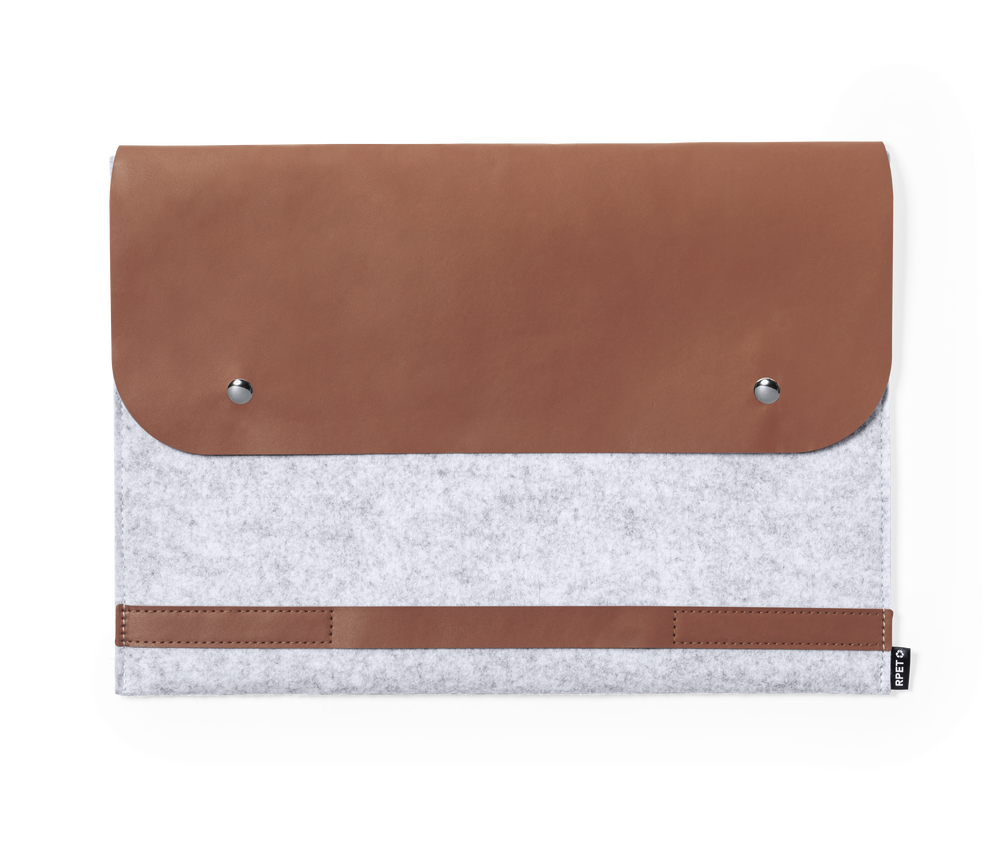 Nature line, genuine and soft computer case, made of resistant Felt RPET. Main compartment with brown PU leather flap and clasp fastenings. Matching color PU leather strap at the base, with handle function. For laptops or tablets up to 14 inches. RPET label outside.