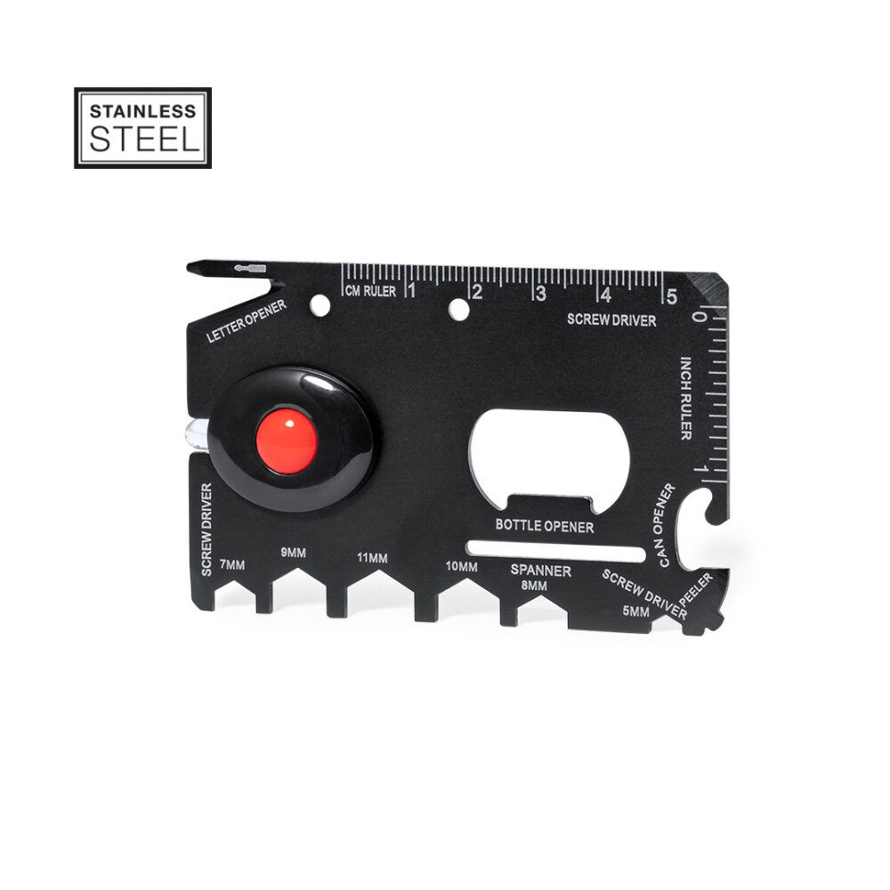 Multi tool – Flat card-shaped design with 16 functions: flat screwdrivers, letter opener, ruler in cm and inches, bottle opener, can opener, peeler, spanner for hex nuts in various sizes and torch (button battery included).