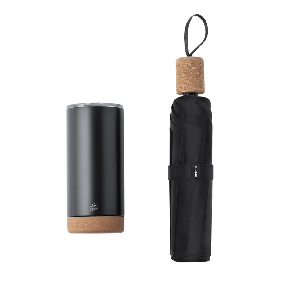 This sophisticated set includes a recycled stainless steel thermos tumbler with a double wall and 550 ml capacity, finished in an elegant matte black. The tumbler features a cork base, a push-on lid, and a dispenser. Also included is a foldable black umbrella with a 98 cm diameter, made from 190T RPET pongee material with a cork handle. The umbrella features a manual opening, windproof mechanism, and fiberglass ribs, along with a distinctive RPET label.