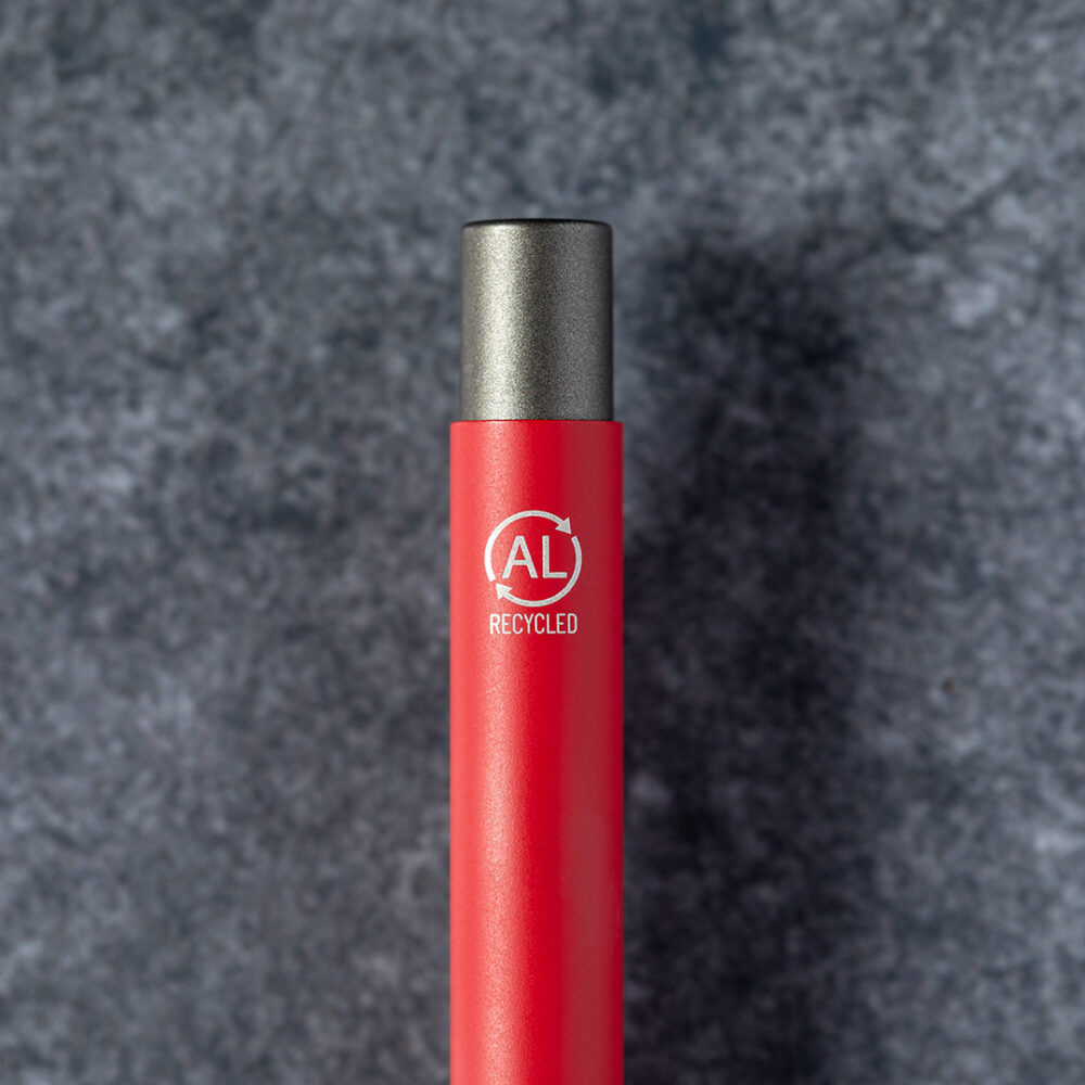 Eco-friendly ball pen manufactured in recycled aluminum, whose origin lies in the almost infinite reuse of one of the materials with the greatest potential for recyclability, while retaining its original properties. This factor makes it an eco-friendly material of recycled origin and easily recyclable. In addition, the residues obtained during the recycling process can be recovered to obtain new reusable resources, consuming less energy in its manufacturing phase, among other sustainability factors. Push-button mechanism, and available in a wide range of metallic colors, with chrome-plated accessories. Metallic clip, blue ink and recycled aluminum logo on the upper part of the ball pen. GRS (Global Recycled Standard) certification, guaranteeing the recycled origin of the material used to manufacture the product.