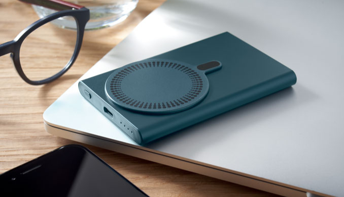 Magnetic wireless charger (15W) in recycled aluminium and power bank (5000 mAh). Output: DC 9V/1.66A. Supports quick charging technology (20W). In/Output: Type-C. Power delivery (PD) support to charge the newest laptop MacPro®. In/Output: Type-C.