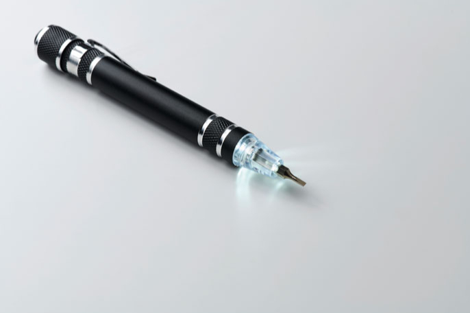 Recycled aluminium multi tool in pen shape with torch. Includes 3 slotted and 3 Phillips screwdriver heads. 4 button cell LR41 batteries included.