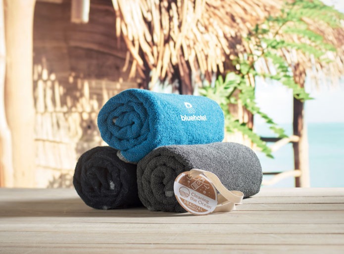 Elevate your bathing experience with our eco-friendly jacquard towel, a testament to sustainable luxury. This towel is crafted from recycled fabrics, blending 70% recycled cotton and 30% recycled polyester SEAQUAL® to create a plush, absorbent fabric weighing 500 gr/m². Measuring 70×140 cm, it offers generous coverage and comfort, perfect for wrapping yourself in after a refreshing bath or swim.