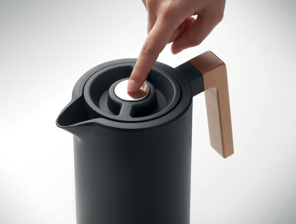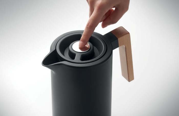 Double wall insulated vacuum jug recycled stainless steel (90% recycled stainless steel and 10% stainless steel) inside and PP outside wall with wooden handle. Capacity: 1L.