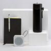 Elegant premium set, including: Double-walled thermos cup in stainless steel. 640 ml capacity, with bamboo area on the lid for branding. Soft PU notepad with integrated smartphone holder on the cover and bamboo area for branding. Including elastic closure, bookmark and matching color pen holder. Inside with 80 single-stripe layout sheets. Matte finish aluminum ball pen with bamboo area for branding, twist mechanism and blue ink. Presented in an individual, matte-finish case with magnetic closure, including inner die-cutting for each of the set’s elements.