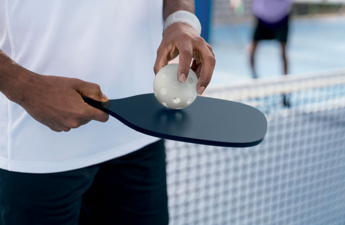Pickle ball paddle set with 2 MDF wooden bats and 1 ball in RPET mesh drawcord pouch.