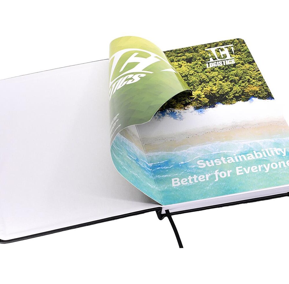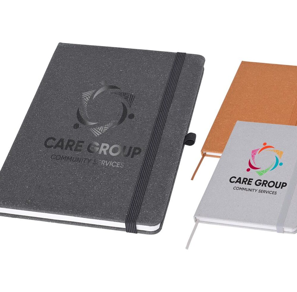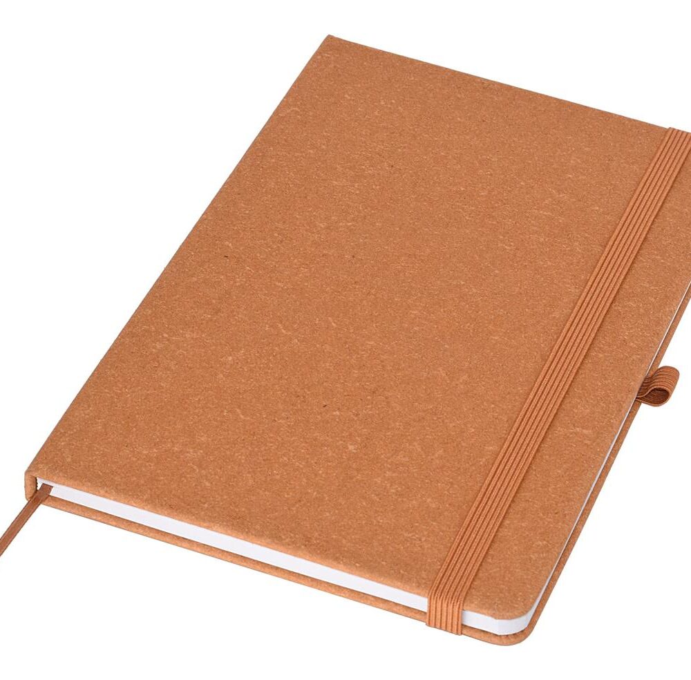 Our eco-conscious A5 notebook, thoughtfully crafted from recycled materials designed to make a positive impact on the environment while boosting brand visibility. With a sturdy hard cover made from Recycled Bonded Leather and 80gsm recycled paper, this notebook embodies sustainability without compromising quality. Complete with a colour-coordinated 9mm elastic closure and pen loop for added convenience. Each page proudly displays a recycled logo, along with an explanation of the recycled components on the inside front page, ensuring users are informed of its environmental credentials. Enhance the presentation with an optional Gift Box (see W17 for details), making it an ideal eco-friendly gift option.