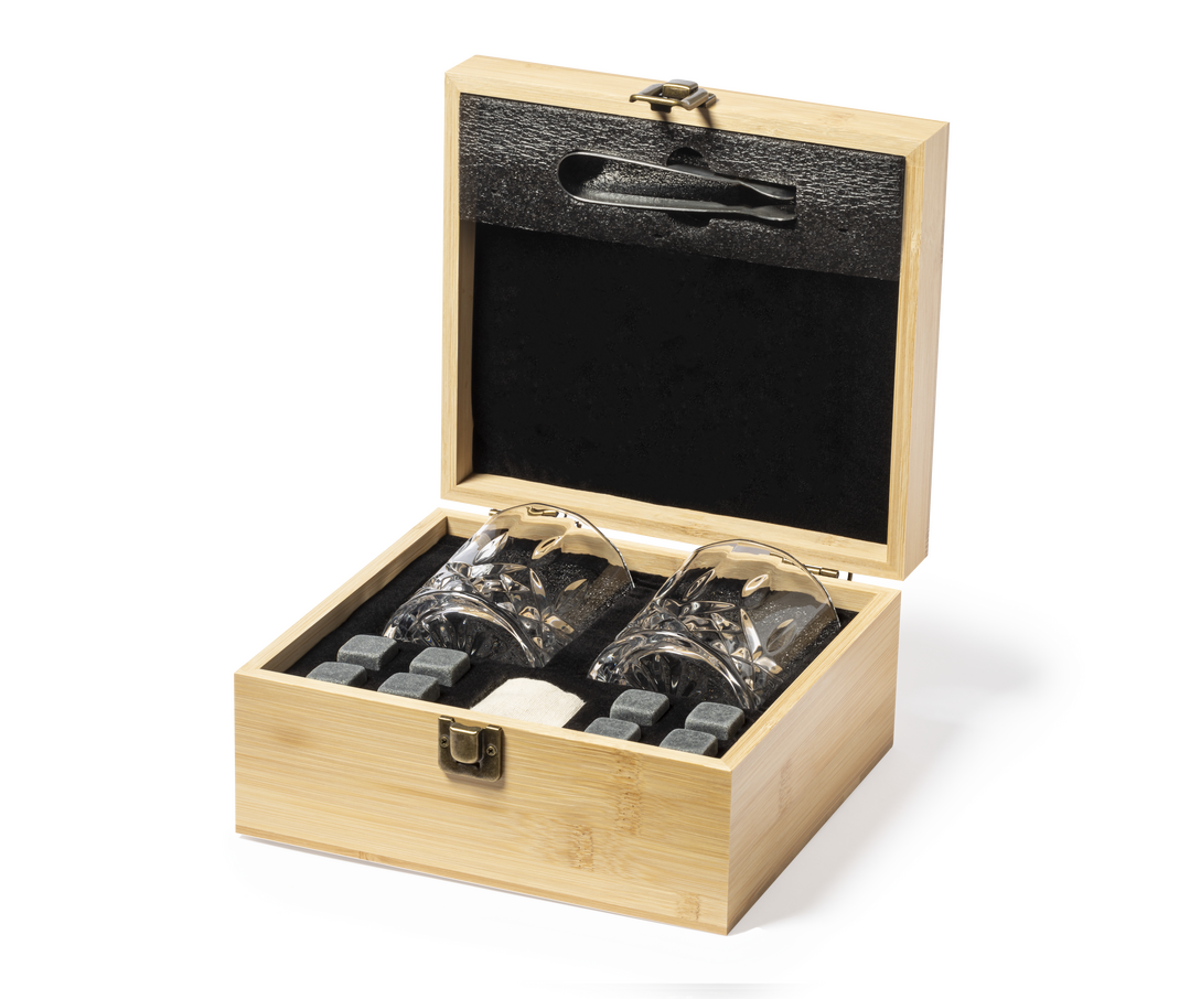 Whisky set in elegant bamboo case with die-cut inside. Including 2 x 320ml glasses, tweezers and 8 reusable natural stone cubes, with cotton pouch. Presented in an individual box with kraft design. The reusable cubes are manufactured in natural steatite stone, also known as soapstone. The drink is kept cold without altering its properties by not diluting its content in water, as well as maintaining its original flavour.